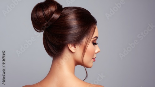 Brunette Elegance: Smooth Hair Bun From Behind Against a Gray Background