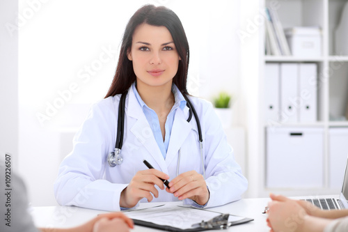 Brunette female doctor talking to patient in the hospital