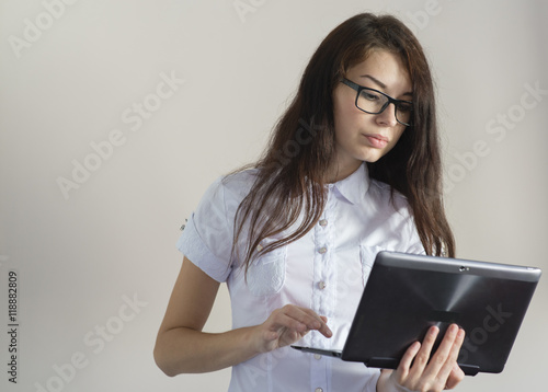 brunette in glasses and a white blouse with a laptop