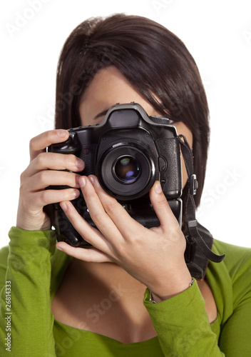 artistic, attractive, beautiful, beauty, brunette, camera, creative, electronic, equipment, face, female, funky, girl, good-looking, hobby, photographer, photographic, photo, pretty, slr, sophisticated, studio, white, white background, woman, young