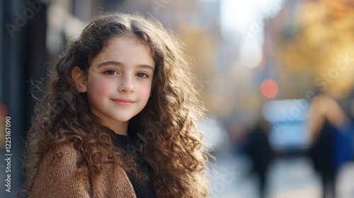 Brunette teenage girl with curly hair smiles in urban setting with autumn colors and sunlight on city street background.