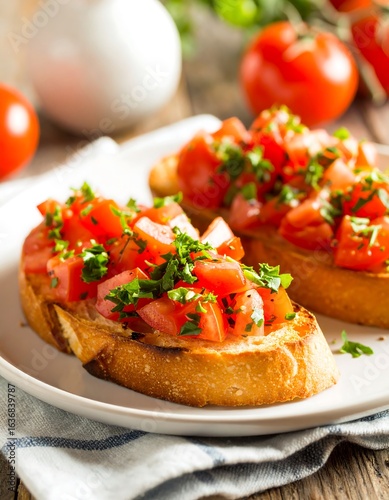 Bruschetta, toasted bread topped with diced tomatoes and fresh herbs