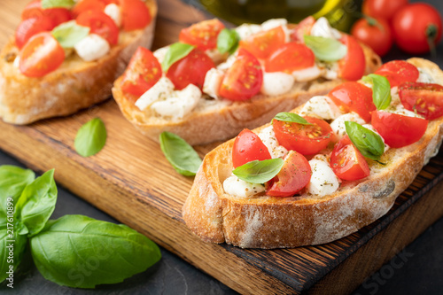 Bruschetta with tomatoes, mozzarella cheese and basil on a cutting board. Traditional italian appetizer or snack, antipasto