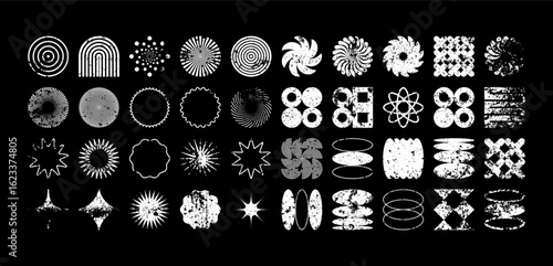 Brutalist geometric shapes, modern grunge symbols. Simple primitive elements and forms, distressed details. Retro design, aged, vintage, trendy contemporary minimalist style, y2k. Vector illustration