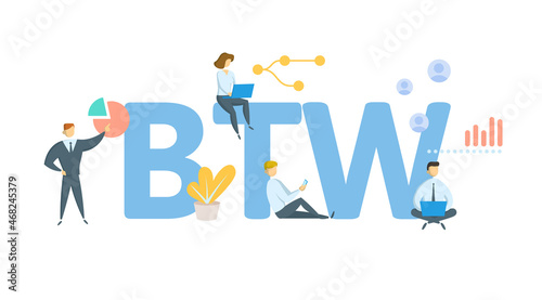 BTW, Back to Work. Concept with keyword, people and icons. Flat vector illustration. Isolated on white.