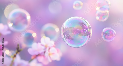 Bubbles floating among cherry blossoms nature scene colorful background soft focus serenity and playfulness