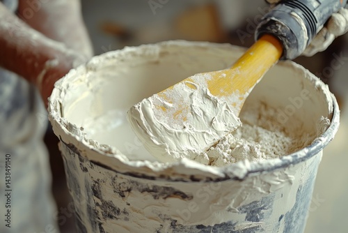 Bucket filled with creamy white batter being stirred with a wooden spatula
