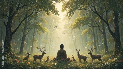 Buddha surrounded by animals in peaceful forest setting