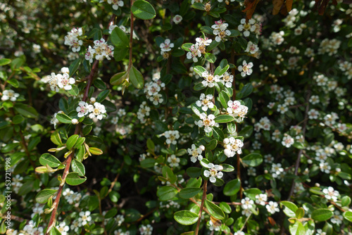 Buds and white flowers of rock cotoneaster in mid May