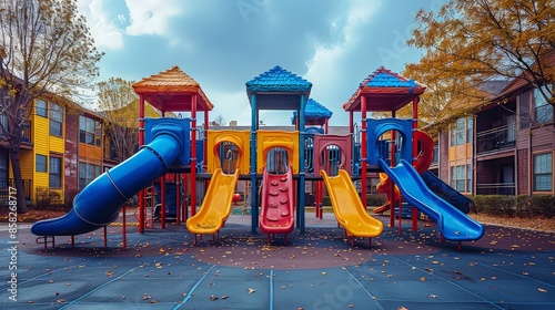 Building a playground swings and slides, colorful equipment,