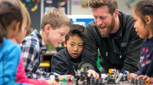 Building Blocks of Knowledge: A passionate teacher guides a diverse group of elementary students in a hands-on STEM activity, fostering a love for learning through play.