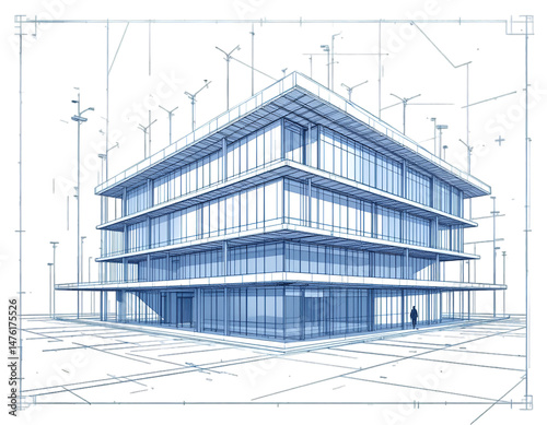 building, blueprint, drawing, architecture, design, perspective, glasses, wall, architectural, structure, construction, exterior, facades, urban, development, project, concept, illustration, figure, person, standing, outdoors, modern, geometric, office, real estate, city landscape, artwork, vignetting, technical, rendering, abstract, visualisation, style, contemporary, scene, location, presentation, planning, engineering, estate, commercial, corporate, stronger, plan, corner, grid