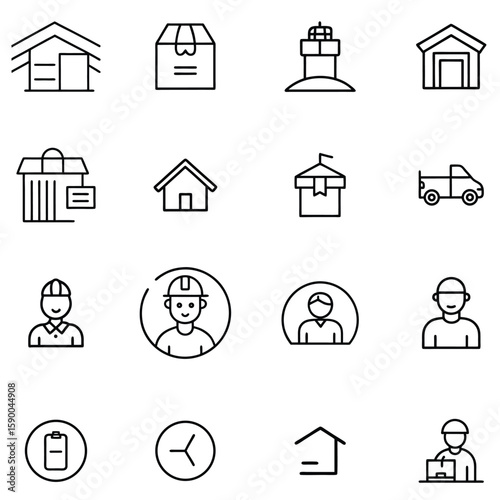 house, building, delivery, box, package, truck, men at work, person, avatar, clock, battery, icon, outline, simple, graphic, design, vector, illustration, service, logistic, transportation, time, power, energy, symbol