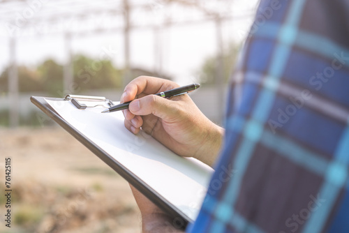 Building inspection asian contractor young man hand writing on clipboard, reconstructed construction, renovation or check defect, before finish handing it over to client, customer. Engineering worker.