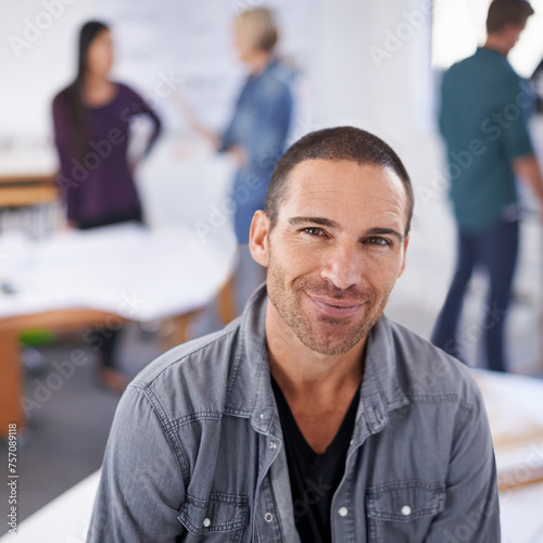 Building, smile and portrait of architect man in office for creative, design or project management. Architecture, construction and development with face of mature designer in professional workplace