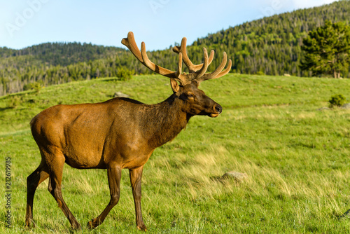 spring, elk, sunset, evening, mature, big, young, strong, male, bull, buck, velvet, antler, wild, animal, wildlife, mountain, forest, pine, evergreen, tree, meadow, green, grass, hill, standing, walking, grazing, feeding, closeup, detail, rocky mountain national park, national park, estes park, park, colorado, us, nature, scenic, mammal, sunny, sky, famous place, travel destination, full body, side, head, eye, ear