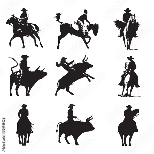 silhouette, vector, animal, illustration, sport, rider, riding, black, race, animal, jockey, cowboy, farm, jump, run, set, icon, art, bull, cow, collection, silhouette