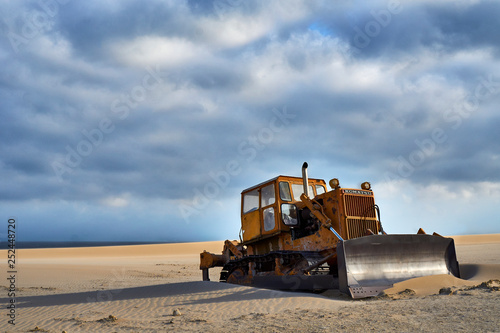 bulldozer, construction, machine, equipment, machinery, tractor, industry, heavy, yellow, vehicle, loader, truck, shoveling, road, work, industrial, sky, shoveling, earth, big, sand, wheel, building, site, blue, tarifa, spain, travel, desert