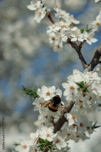 bumblebee, flower, nectar, bloom, tree, spring, garden, blossom, park, bumblebee, closeup, pollinate, cherry, fruit farm, collect, insect, fruit, nature, pollination, pollen, sunny, weather, white, tree branch, blooming, springtime, season, sunlight, outdoors, blurred background, copy space