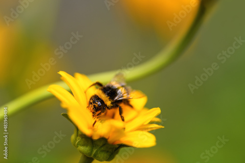 Bumblebee. One large bumblebee sits on a yellow flower on a Sunny bright day. Macro horizontal photography