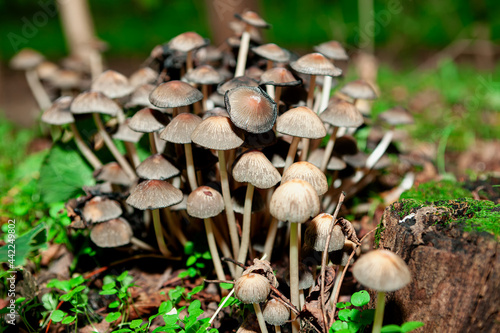 Bunch of mushrooms in the forest . Uncultivated fungus