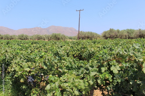 Bunch of red wine grapes on vine in a vineyard near Stavros Beach in Crete Island, Greece.