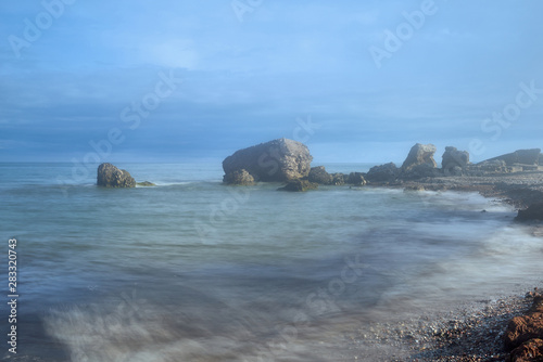 Bunker ruins near the Baltic Sea beach, part of the old fortress in the former Soviet Union base "Karosta" in Liepaja, Latvia. Fog in Karosta fort.