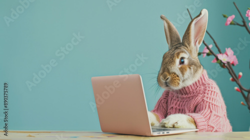 easter bunny, working, laptop, holiday, vintage, rabbit, technology, festive, creative, whimsical, cosy, sweater, easter, digital, unique, playful, charming, nostalgic, holiday spirit, modern, quirky, adorable, festive attire, spring, seasonal, joyful, classic, relaxed, cute, innovative, delightful