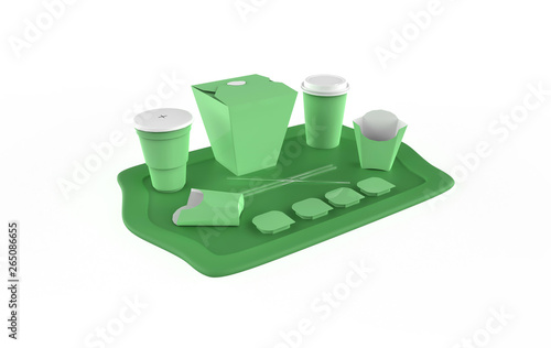 burger bar set with blank for design fast food cardboard tableware mockup template paper cups. 3d illustration