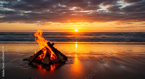 Burning Bonfire on Sandy Beach during a Spectacular Golden Sunset over the Ocean with Reflections