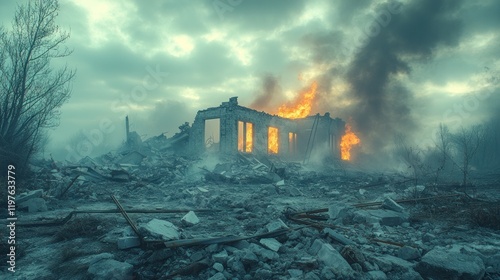Burning building amidst rubble, post-conflict landscape, smoky sky, war devastation