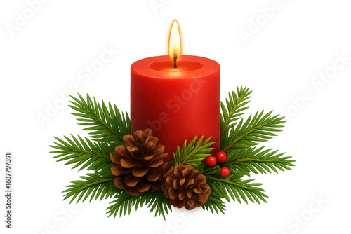 christmas, candle, burning, red, pine, cone, holly, berry, fir, decoration, festive, holiday, celebration, winter, light, flames, warm, cosy, greeting, card, invitation, season, traditional, december, christmas, new, year, eve, advent, spiritual, hope, peace, joy, love, family, home, decor, design, element, object, realistic, three-dimensional, render, illustration, transparent, background, isolated, white