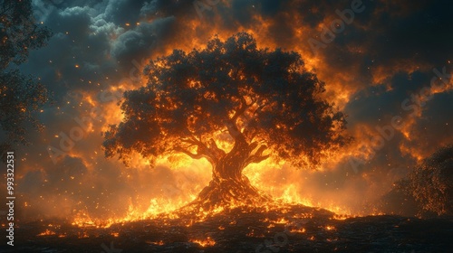 tree, fire, burning, storm, ember, flames, dramatic, sky, stormy, cloud, glowing, surreal, nature, landscape, power, contrast, destruction, blazing, heat, intensity, mystical, wild, energy, high-coloured, apocalyptic, fiery, night, scenery, mystic, sunset, orange, sun, cloud, red, dusk