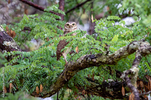 Burrowing owl camouflaged in the branch of a tree in the cerrado biome on a rainy day