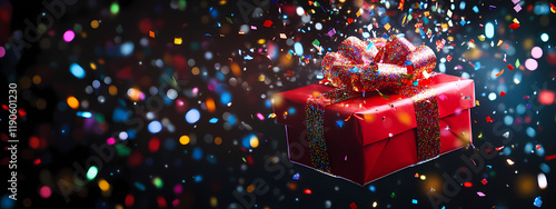 bright, red, present, many-coloured, confetti, glowing, light, mid-air, radiant, sparkle, deep, black, background, festive, explosion, dynamic, joyous, celebratory, magical, vibrant, colours, holiday, theme, motion, visual, energy, contrast, exciting, illuminated, particle, cheer, spirit, generative, ai, christmas, gift, box, bow, ribbon, decoration, christmas, tree, celebration, birthday, isolated, gift, surprise, object