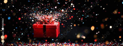 bright, red, present, many-coloured, confetti, glowing, light, mid-air, radiant, sparkle, deep, black, background, festive, explosion, dynamic, joyous, celebratory, magical, vibrant, colours, holiday, theme, motion, visual, energy, contrast, exciting, illuminated, particle, cheer, spirit, generative, ai, christmas, gift, box, bow, ribbon, decoration, christmas, tree, celebration, birthday, isolated, gift, surprise, object