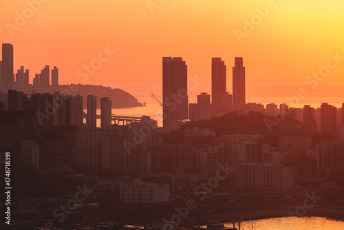 Busan sunset city panorama, beautiful skyline view with high-rise buildings skyscrapers at dawn, Busan port daybreak, cityscape with harbor bay, South Korea, Yeongnam district, sunny day