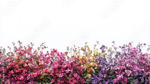 Bush or shrub wall in full bloom, filled with bright, vivid flowers isolated on white background