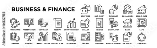 Business & Finance Icon Set. Editable Stroke Icon Collection. Briefcase, Bar Chart, Pie Chart, Dollar Sign, Credit Card, Wallet, Invoice, Calculator, Bank, Safe, Handshake, Presentation, Contract, Rec