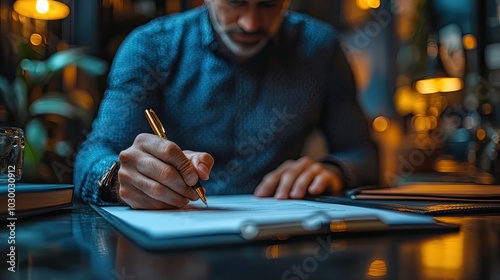 Business agreement signatures are featured as a businessman signs documents.