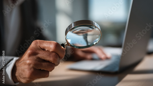 business, analysis, magnifying, glasses, laptop, computer, search, research, investigation, office, workplace, professional, hand, finger, technology, digital, online, corporate, work, desk, studying, exam, datum, information