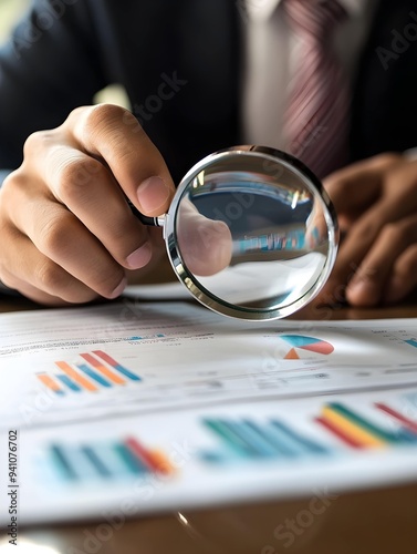 Business analytics and statistics are explored by a businessman using a magnifying glass, suggesting a deep dive into data and reports