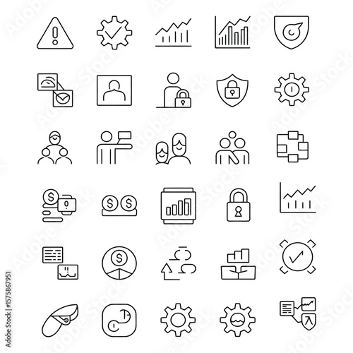 business, finance, icon, set, technology, datum, security, people, teamwork, money, growth, chart, graph, gear, setting, lock, shield, warning, time, clock, strategy, workflow, communication, document, network, diagram, concept, line art