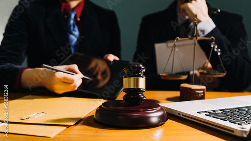 Business and lawyers discussing contract papers with brass scale on desk in office. Law, legal services, advice, justice and law concept picture with film grain effect