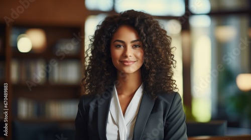 business and office concept - smiling businesswoman with curly hair in office Generative AI