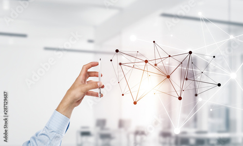 Business and technology concept with networking grid and man using device