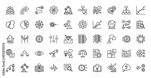 icon, vector, set, line, technology, business, analysis, strategy, production, datum, development, intelligence, pictogram, collection, symbol, process, graph, chart, puzzle, research, learning, finance, quality, optimization, mind, brain, algorithm, circuit, chips, globe, cloud, vision, science, manufacturing, automation, gear, engine, industry, cognition, solution, control, growth, progress, outline, minimal, editable