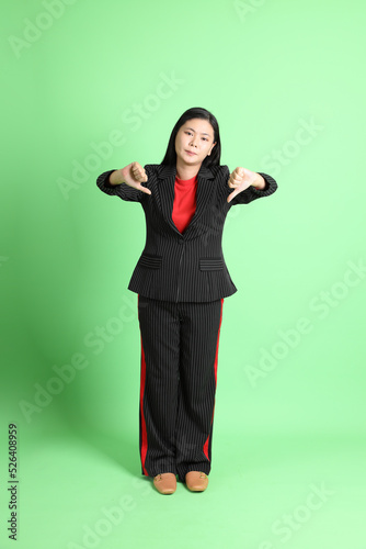 person, woman, business, portrait, asian, businesswoman, female, adult, young, isolated, professional, cheerful, lady, happy, corporate, background, attractive, chinese, beautiful, smile, confident, standing, suit, colours, green, negative, gesture, bad, disapproval, communication, dislike, unhappy, bankruptcy, rejection