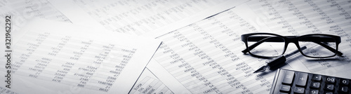 Business banner, calculator, pen and eyeglasses on report