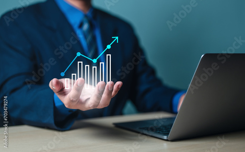 business, chart, graph, growth, success, analysis, diagram, digital, finance, investment. close up to hand of businessman, hold the bar chart from finance investment, then analysis that's diagram.